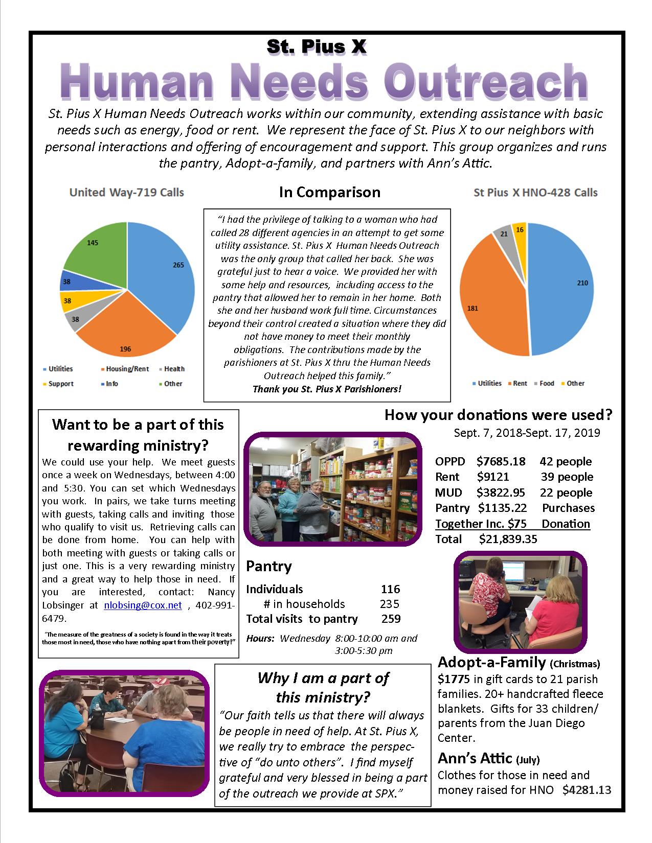 Emergency Outreach/Human Needs Outreach– These funds are used to help meet the needs (specifically with rent, utilities and food) of parishioners and non-parishioners who live within our parish boundaries. Last year’s report of giving.